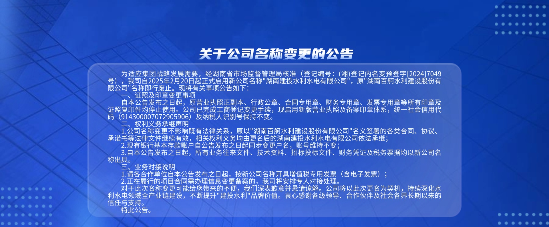 2022年9月,原湖南建工集團與原湖南交水建集團合并組建湖南建設投資集團。原雙方集團旗下的湖南百舸水利建設股份有限公司和湖南建工集團水利水電工程公司合并為湖南建投百舸水利公司,實行兩塊牌子(百舸水利、建工水利)管理,為湖南建投集團唯一水利建設企業(yè)。2024年9月,公司正式更名為湖南建投水利水電有限公司(簡稱湖南建投水利),統(tǒng)籌管理“百舸水利”“建工水利”“施工公司”“疏浚公司”等子品牌。